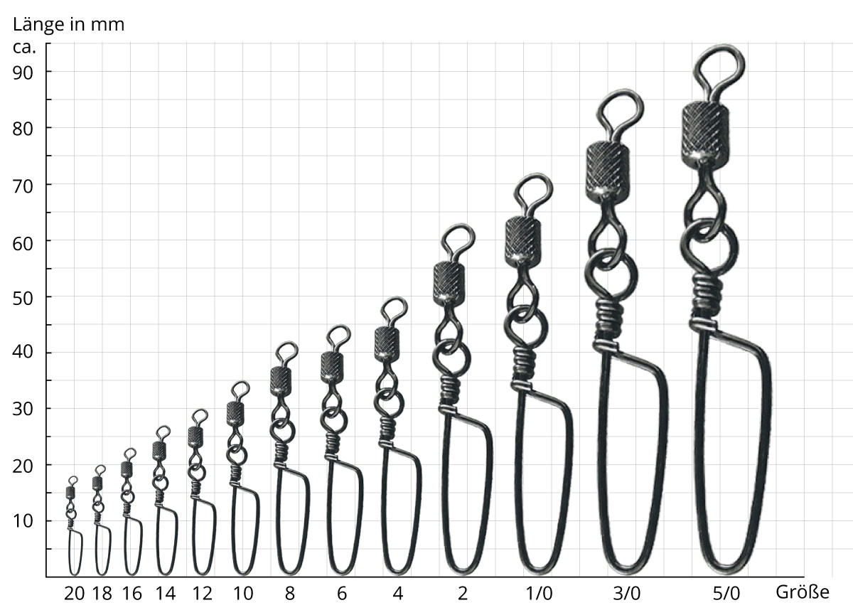 Wählen Sie passend zum Zielfisch, die entsprechende Größe und Tragkraft des Wirbels aus. So benötigen Sie, bei größeren Fischen auch mehr Tragkraft und beim Meeresangeln widerstandsfähige Einhängewirbel aus Edelstahl. Die Angabe der Größe bei Wirbel-Karabinern bedeutet für Angler, dass die Größe 2 größer ist, also eine höhere Tragkraft besitzt, als die Größe 4 und so weiter.