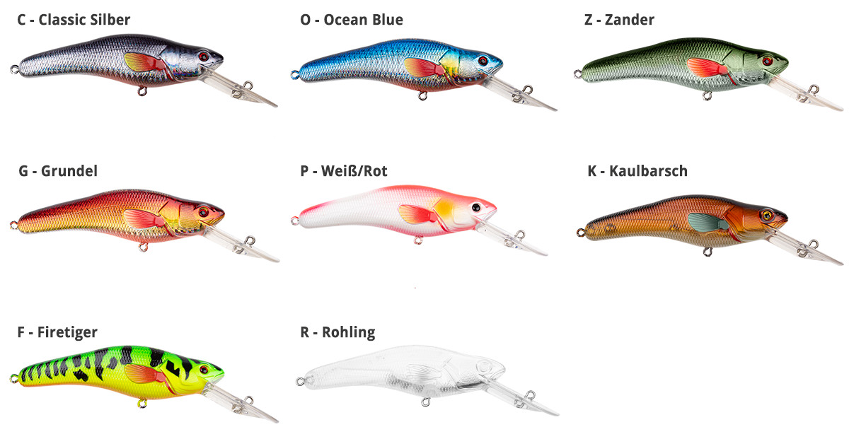 Die Crank Runner werden in 8 Farben, in einer Länge von 115 mm (ohne Tauchschaufel gemessen) angeboten. Außerdem sind sie unlackiert und unverpackt. Die Rohlinge müssen vor Gebrauch mit Klarlack versiegelt werden.
