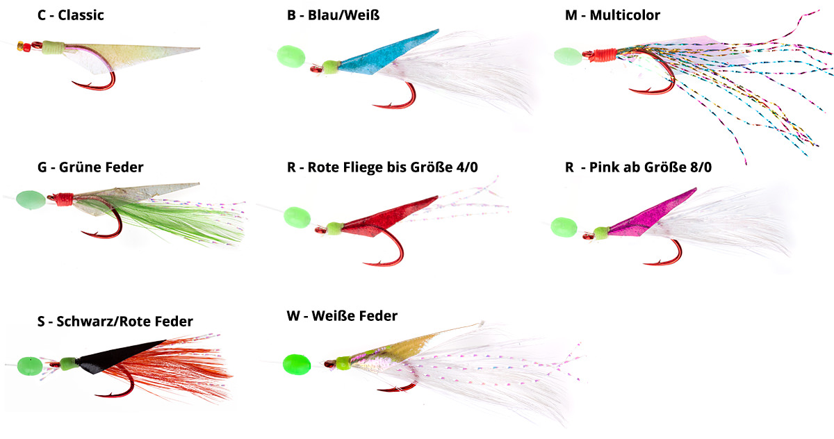 - Farbe Classic ohne Feder (nur Gr.10 und 6 mit Goldhaken, Gr. 2, 1/0, 4/0, 8/0 und 12/0 roter Haken bzw. Edelstahlhaken)