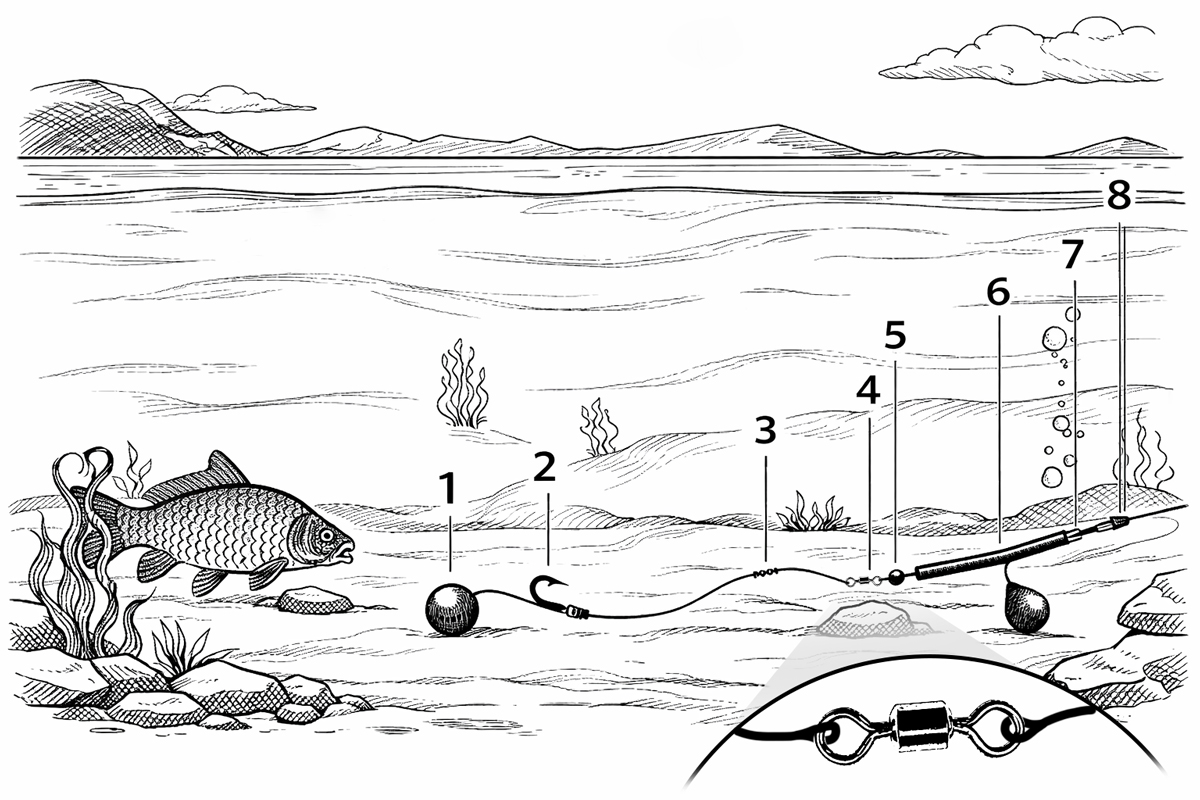 Der Haken (2) wird über das 15-30cm lange Vorfach (3) mit 15-30 kg Tragkraft mit unserem Carp-Rig Wirbel (4) verbunden. Von dort verläuft die Monofil-Hauptschnur (8). Für den Nahbereich bis 100m empfehlen wir ein Monofil mit 0,3 bis 0,4mm und für Distanzfischen bei 120 bis 200m eine 0,18 bis 0,25mm Schnur. Auf der Hauptschnur kann z. B. noch eine Kunststoffperle (5) 4-6mm, ein Anti-Tangle-Boom (6) mit 60-120g für Selbsthakmethode/Selbstanschlag und ein Gummistopper (7) montiert werden.