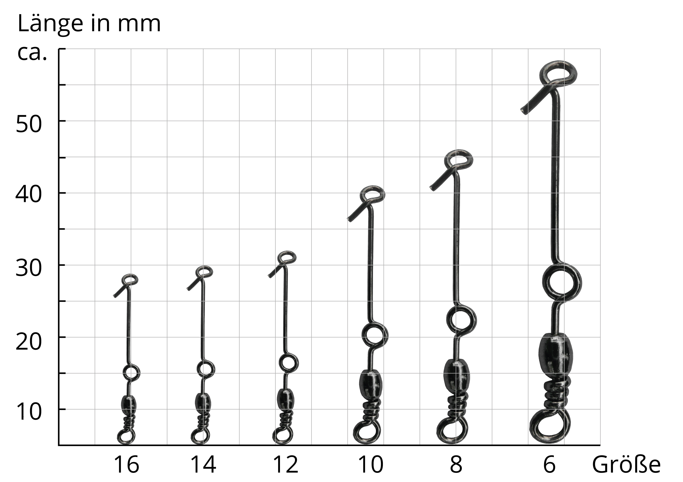 Von ganz klein in Gr.16 für feine Mono- bzw. geflochtene Schnüre bis zur superstabilen Gr. 6 für alles darüber, sogar bis zur Waller- und Meeresangelei. Die ehemalige Schwachstelle, wird durch die Knotenlos-Wirbel zur wahrscheinlich stärksten Verbindung zum Fisch in Ihrer Ausrüstung. Ein kleiner unauffälliger Verbinder, der mehr bietet, als man erwartet, zu einem sehr günstigen Preis.