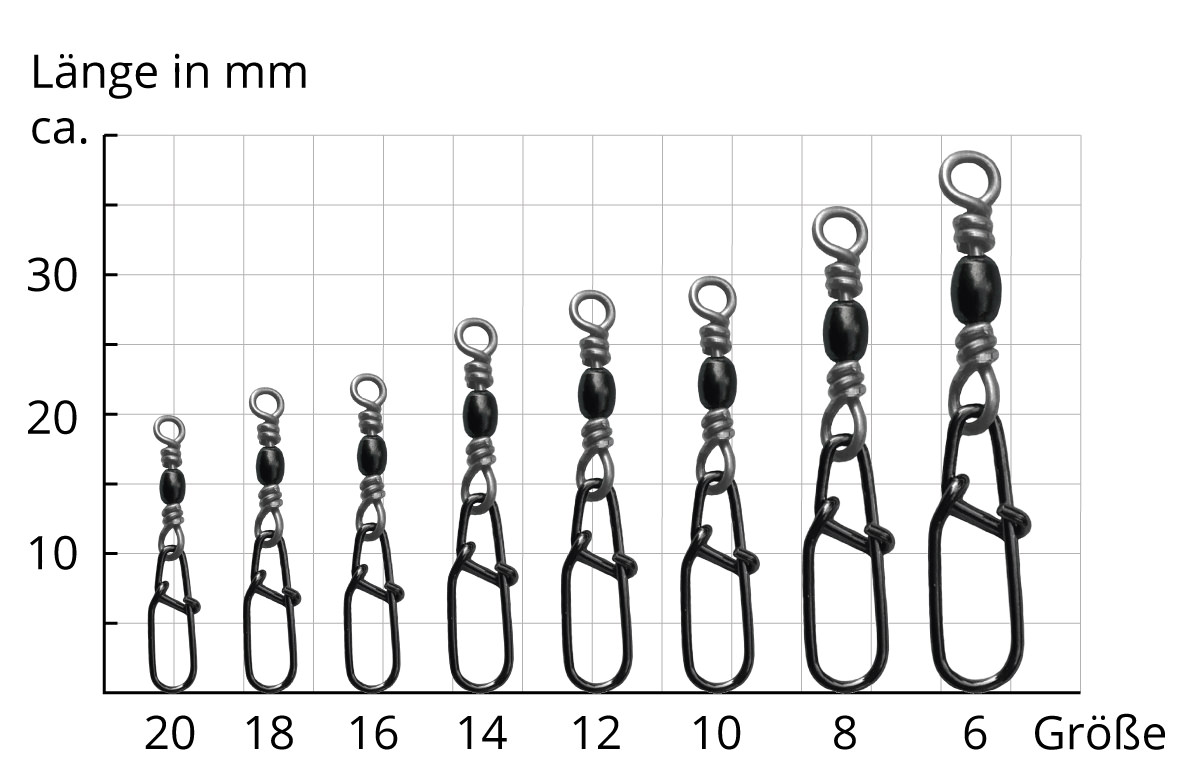 Wählen Sie passend zum Zielfisch, die entsprechende Größe und Tragkraft des Wirbels aus. So benötigen Sie, bei größeren Fischen auch mehr Tragkraft und beim Meeresangeln widerstandsfähige Einhängewirbel aus Edelstahl. Die Angabe der Größe bei Wirbel-Karabinern bedeutet für Angler, dass die Größe 2 größer ist, also eine höhere Tragkraft besitzt, als die Größe 4 und so weiter.