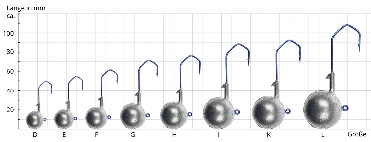 Größen: Rundkopf-Dorschbomben zum Vertikalfischen werden in 8 Größen unterschieden: D=2/0, E=3/0, F=5/0, G=6/0, H=7/0, I=8/0, K=9/0, L=10/0. Die Gr. D ist z.B. für einen ca. 8 cm Gummiköder, die Gr. E für einen 10cm langen und bis Gr. L für Köder über 20cm. Die Jig-Köpfe sind mit einem Buchstabencode versehen. Alle unsere Softplastic-Lures, ATTRACTOR-Shads, RIPTOR-Shads, ZANDERTAIL und TURBOTAIL-Twister haben auch einen Buchstaben eingraviert auf der Flanke stehen. Twister-Köpfe und Weichplastik-Köder mit gleichem Buchstaben-Code passen zusammen.